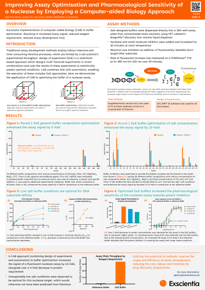 Traditional assay development methods are often labour-intensive, time-consuming and limited by the experimental throughput of a lab scientist. Design of Experiments (DoE) is a statistical-based approach which designs multi-factorial experiments in smart combinations, and uses the results of these experiments to statistically predict optimal conditions. Computer-aided biology (CAB) combines DoE with automation, enabling the execution of these complex DoE experiments. The CAB approach to assay development enables the rapid determination of optimal conditions by allowing a scientist to test tens of thousands of factors in just one or two experiments. Here, we demonstrate the application of an Exscientia-developed CAB method to the buffer optimisation of a nuclease assay, where we saw an increase in signal-background of 15-fold and a decrease in protein requirement by over 3-fold, in conditions which were not readily obvious from literature. This assay, which was previously unstable and with low signal using standard conditions, is now robust and highly sensitive. Thus, demonstrating the power of CAB to simultaneously improve an assay’s performance and reduce the cost, labour and timelines for drug discovery programmes.