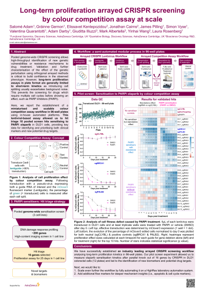 Abstract: Pooled genome-wide CRISPR screening allows high-throughput identification of new genetic vulnerabilities or resistance mechanisms to drug treatment. Validation and further characterisation of the effect of the genetic perturbation using orthogonal arrayed methods is critical to build confidence in the observed phenotype. However, long-term proliferation assays at scale are generally limited to short-term kinetics as introducing cell splitting usually exacerbates background noise and is difficult to automate. This prevents the screening of sensitisation or resistance hits to PARP inhibitors which requires multiple cell cycles before showing an effect.