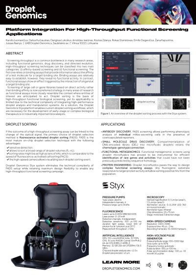 Abstract: Screening throughput is a common bottleneck in many research areas, including functional genomics, drug discovery, and directed evolution. High-throughput screening techniques can be classified into two main categories: (i) affinity-based screening and (ii) functional screening. The first one relies on binding assays that provide information about the affinity of a test molecule for a target binding site. Binding assays are relatively easy to establish, however, they reveal no functional activity. In contrast, functional assays show an effect triggered by the interaction of a ligand at a target binding site. Functional assays might be based on a broad range of readouts, such as cell proliferation, reporter gene expression, downstream signaling, and other effects that are a consequence of ligand binding. Screening of large cell or gene libraries based on direct activity rather than binding affinity is now a preferred strategy in many areas of research as functional assays more closely resemble the context where entities of interest are anticipated to act. Droplet sorting is the foundation of high-throughput functional biological screening, yet its applicability is limited due to the technical complexity of integrating high-performance droplet analysis and manipulation systems. As a solution, Styx platform enables custom droplet sorting workflows, which are necessary for the development of early-stage or complex biological therapeutics or industrially important biocatalysts. The poster will focus on the technical design considerations of Styx in the context of its application spectra.