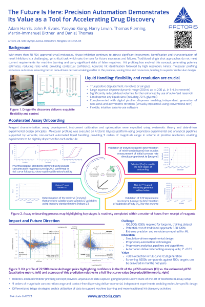 Abstract: Despite the high hopes, still only 50 kinase inhibitors have been approved by the FDA to date. While identification and characterisation of novel inhibitors is an absolutely critical task, irreproducibility prolongs drug development pipelines, hikes up the costs and ultimately leads to high attrition rates. The solution is simple to pinpoint, but incredibly hard to achieve: accurate hit identification followed by high resolution, kinetic molecular profiling. This leads to better data-driven decisions, not only saving time and resources, but also leading to superior molecular design. Arctoris has developed a robotics-enabled process for fully automated inhibitor profiling, providing an unparalleled depth of data capture, going beyond the current state-of-the-art of biochemical assay setup. Exploiting gold standard assay methodologies coupled to state-of-the-art dispense capabilities and rapid analytical integration, we can deliver robust and reproducible assays within days and profiling activities within hours. Reagent characterisation, assay development, calibration, and optimization are expedited through systematic multifactorial experimental design, facilitated using high density plate formats. Our platform affords 9 orders of magnitude range in liquid volume handling, with picolitre precision and contact-free digital dispensing for true, non-serial, independent experimentation enabling experiments to be designed exclusively for each molecule. Fully automated protocols can be optimized, validated, versioned, and explicitly encoded within hours. Data highlighting accelerated assay onboarding and profiling activities, enabled through integration of the high precision, versatile dragonfly discovery reagent dispenser, will be shown. Differentiated triage strategies are presented to enable the utilisation of data to support machine learning and more traditional hit discovery activities for programme progression.