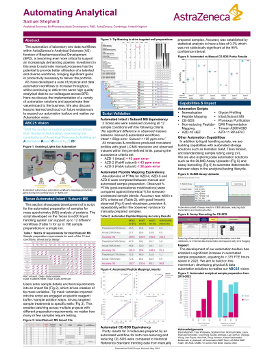 Abstract: The automation of laboratory and data workflows within AstraZeneca’s Analytical Sciences (AS) function of Biopharmaceutical Development (BPD), is becoming ever more critical to support an increasingly demanding pipeline. Investment in this area to automate manual processes has the potential to provide better utilisation of a talented and diverse workforce, bringing significant productivity gains necessary to deliver the portfolio. AS have developed a suite of physical and data automation workflows to increase throughput, whilst continuing to deliver the same high quality analytical data to our colleagues across BPD. Here we discuss the implementation of a variety of automation solutions and approximate their value/impact to the business. We also discuss lessons learned and touch on future endeavours to expand our automation toolbox and realise our Automation vision.