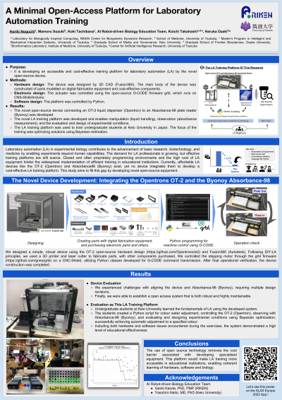 Abstract: Laboratory automation (LA) in experimental biology contributes to the advancement of basic research, biotechnology, and medicine by enabling experiments beyond human capabilities. The demand for LA professionals is growing, but effective training platforms are still scarce. Closed and often proprietary programming environments and the high cost of LA equipment hinder the widespread implementation of efficient training in educational institutions. Three aspects that need to be considered in LA education and training are hardware operation, software scripting and biological experiments. In this study, we propose a low-cost and open-access experimental platform designed to facilitate LA training. It combines an open source OT-2 liquid dispenser (Opentrons) and a small and low-cost Absorbance 96 plate reader (Byonoy) with a newly developed open source microplate transport device. We have also developed software tools to control our platform using Python, a popular programming language. Our platform combines manipulation (liquid handling), observation (absorbance measurement), evaluation and design of experimental conditions, enabling an autonomous loop that searches for optimal experimental conditions. The use of open source technology removes the cost barrier associated with developing specialised equipment. This platform would make LA training more accessible in educational institutions, enabling coherent learning of hardware, software and biology.