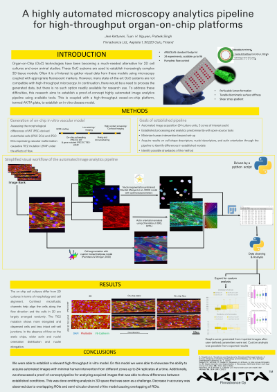 Abstract: In recent years, organ-on-chip (OoC) technology have been becoming a much-needed alternative to conventional 2D cell cultures and even animal studies. OoC systems are a platform to construct complex 3D tissue models that provide relevant in vivo parameters. In these models, the information of interest often pertains to cellular features such as the morphology of the cell or subcellular localization of features of interest. A visual acquisition system, such as confocal microscope, is often used in conjunction with an appropriate fluorescent marker to gather this data. However, many of the current state-of-the-art OoC systems lack compatibility with high-throughput imaging systems. Additionally, many of the available tools for the analysis of acquired visual data seem to lack the necessary capabilities to keep up with more complex tissue models out of the box. To address these difficulties, this research aims to develop a highly automated image analysis pipeline coupled with a high throughput vessel-on-chip platform, termed AKITA Plate, and establish an in vitro disease model with advanced data analytics. We developed a standardized, high-throughput vessel-on-chip platform capable of 24 parallel experiments on a standardized ANSI 96-well plate footprint that can be integrated into an industrial automation system. This platform was used to establish comparative vascular tissue models between healthy endothelial cells and endothelial cells carrying a vascular anomaly (VA) Tie2 point mutation. These models were subjected to various micro-physiological stimuli before being immunostained with appropriate markers and imaged using a confocal microscope to generate datasets for pipeline assessment. This data was used to evaluate the usability of a variety of available open-source tools and combinations thereafter to produce a proof-of-concept pipeline for the analysis of features of interest such as morphology, orientation, and attachment of cells. This was achieved utilizing available machine learning (ML) models mainly used for the analysis of 2D cell cultures as a starting point to train appropriate models for an OoC use case. In a comparative study between healthy and mutated cells, we were able to utilize the established pipeline to extract data out of acquired datasets with minimal human intervention. The extracted data of cell shape, orientation, and attachment was able to show an expected difference between healthy and mutation-carrying cells. With this, we have been able to establish a proof-of-concept image analytics pipeline with a minimal human intervention that could be implemented into automated systems with further improvements which can be used to aid in data generation and analysis in high-throughput use cases, such as drug testing.