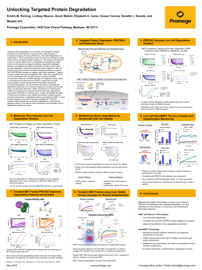 Abstract: Targeted protein degradation is a promising new therapeutic strategy consisting of small molecules, most commonly molecular glues or Proteolysis Targeting Chimeras (PROTACs), which elicit degradation of a target protein. These compounds function to bring into proximity the target protein with an E3 ligase complex component. This results in formation of a ternary complex which serves to ubiquitinate and degrade the target protein via the ubiquitin proteasomal pathway. Significant challenges persist to characterize the cellular mechanism of action and the highly dynamic degradation responses induced by these compounds. Here we present a live-cell, luminescence-based technology platform, combined with CRISPR/Cas9 endogenous tagging, with these capabilities. Tagging of target proteins with the small peptide, HiBiT, which has high affinity for and can complement with the LgBiT protein to produce NanoBiT luminescence, allows for sensitive detection of endogenous protein levels in living cells and can also serve as a BRET energy donor to study protein:protein or protein:small molecule interactions required for successful degradation. We demonstrate the ability to quantitate key degradation parameters for compound triaging and ranking including rate, Dmax, and Dmax50. We further confirm mechanism by monitoring the kinetics of induced ternary complex formation and target ubiquitination using either a PROTAC or molecular glue. Finally, we highlight the ability of these tools to identify the key cellular mechanisms underpinning the dramatic improvement in degradation potency and kinetics of SIM1, a novel trivalent degrader, compared to the parent bivalent MZ1 PROTAC. Together, these approaches expand the capabilities for understanding degrader efficacy in live cells as well as identifying next generation protein degradation therapeutic targets.