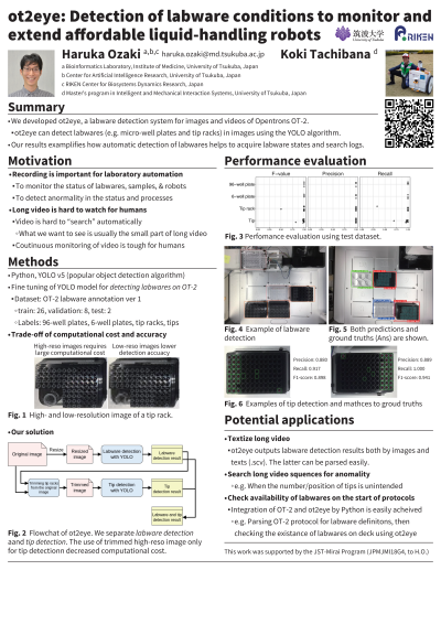 Abstract: In the automation of life science experiments, the types, positions, states, and wears of labwares change according to modifications in experimental protocols and the progress of experimental operations. Accordingly, verifying and recording that the experimental robot is operating in the intended environment is essential for quality assurance and traceability of actions and results. For such purpose, general webcams are used to record fixed-point images inside automated liquid-handling robots, primarily for investigating what happened when abnormalities occur. However, a large number of images and long-duration recordings can make the verification process cumbersome, hindering traceability. To overcome this difficulty, we hypothesized that automatic detection of labwares from images and videos would make it easier to acquire labware states and search logs. Here, to demonstrate the effectiveness of this idea, we developed ot2eye, a labware detection system for Opentrons OT-2. ot2eye can detect labwares in images taken inside the OT-2 using the YOLO object detection algorithm. We built a unique dataset by annotating images of the OT-2 with labware in place and fine-tuned the YOLO object detection algorithm using this dataset. As a result of validation, ot2eye demonstrated high-precision detection of various labware types, such as micro-well plates and tip racks. Furthermore, it was able to accurately detect not only labwares but also the presence or absence of tips in tip racks from a single image. Our proposed method is expected to provide vision to affordable automated pipetting robots and promote AI-Robot-driven life sciences by making the states of labwares machine-readable.