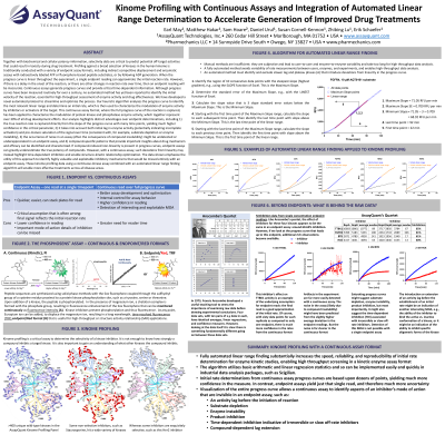 Abstract: Together with biochemical and cellular potency information, selectivity data are critical to predict potential off-target activities that could result in toxicity during drug treatment. Profiling against a broad selection of kinases in the human kinome is traditionally conducted with a variety of endpoint assay formats, including indirect competitive displacement and enzymatic assays with radioactively labeled ATP or fluorophore-based peptide substrates, or by following ADP generation. When the progress curve is linear throughout the experiment, a single endpoint reading can approximate the initial reaction rate. However, if there is a delay in the onset of the reaction, or there are other changes in reaction rate over time, then an endpoint reading will be inaccurate. Continuous assays generate progress curves and provide critical time-dependent information. Although progress curves have been measured routinely for over a century, no automated method has yet been reported to identify the initial velocity of the reaction, essential for high-throughput assessment of enzyme activity and drug effectiveness. We have developed a novel automated protocol to streamline and optimize the process. Our heuristic algorithm analyzes the progress curve to identify the most relevant linear range and determine an initial rate, which is then used to characterize the modulation of enzyme activity by inhibitors or activators of the target. This continuous assay format, where the full progress curve of the reaction is captured, has been applied to characterize the modulation of protein kinase and phosphatase enzyme activity, which together represent over 30% of all drug development efforts. Our analysis highlights distinct advantages over endpoint determinations, including 1) the true reaction rate is captured directly from the slope of the progress curve with many time points, yielding much higher confidence in this critical parameter, 2) it takes into account both initial lag in enzyme activity (potentially indicating incomplete activation) and pre-mature saturation of the signal over time (consistent with, for example, substrate depletion or enzyme instability), 3) the occurrence of noise in an assay (often the consequence of compound insolubility) might be undetected or underappreciated in an endpoint assay, and 4) compound-specific patterns that provide important insights about drug mechanism and efficacy can be identified and characterized. If compound-induced non-linearity is present in progress curves, endpoint assays can greatly underestimate the true potency of compounds. However, with a continuous assay, such deviations from linearity may instead highlight time-dependent inhibition and enable structure-kinetic relationship optimization. The data shown emphasize the utility of this approach to identify highly valuable and exploitable inhibitory mechanisms that would be missed entirely with an endpoint assay. These kinome profiling data using a continuous kinase assay combined with an automated linear range finding algorithm will enable more effective treatments across all disease areas.