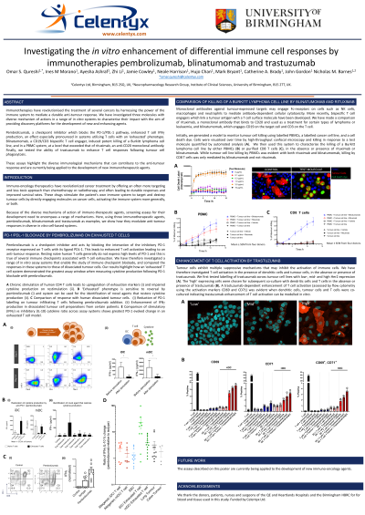 Pembrolizumab, a checkpoint inhibitor which blocks the PD-1/PDL-1 pathway, enhanced T cell IFNg production, an effect especially pronounced in systems utilising T cells with an ‘exhausted’ phenotype. Blinatumomab, a CD19/CD3 bispecific T cell engager, induced potent killing of a Burkitt lymphoma cell line, and in a PBMC system, at a level that exceeded that of rituximab, an anti-CD20 monoclonal antibody. Finally, we tested the ability of trastuzumab to enhance T cell responses following tumour cell phagocytosis.