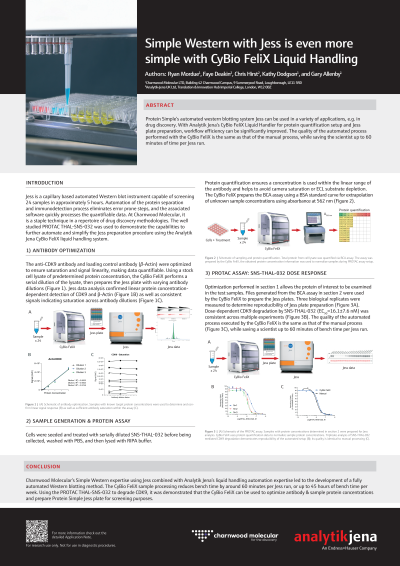 Abstract: Automated western blotting using ProteinSimple Jess can be versatilely used, e.g., for drug discovery. The Analytik Jena CyBio FeliX was used for protein quantification setup and Jess plate preparation, hereby significantly improving workflow efficiency. PROTAC THAL-SNS-032 and its target CDK-9 were used to demonstrate the capabilities to automate and simplify the Jess preparation procedure using the CyBio FeliX liquid handler. First, the anti-CDK9 antibody was optimized to ensure saturation and signal linearity, making data quantifiable. CyBio FeliX performs a serial dilution of assay cell lysates and prepares the Jess plate with varying antibody dilutions. Then, a BCA assay was prepared by the liquid handler to determine protein concentration in lysates obtained from PROTAC-treated cells and to provide a data file for the main PROTAC assay. Last, antibody optimization results and BCA assay data were combined to set up the Jess plates, again using the CyBio FeliX liquid handler for process automation. Jess data analysis confirmed linear protein concentration-dependent detection of CDK9 as well as consistent signals indicating saturation across antibody dilutions. Dose-dependent CDK9 degradation by SNS-THAL-032 was consistent across multiple experiments. The quality of the automated process executed by the CyBio FeliX is the same as that of the manual process, while saving a scientist up to 60 minutes of bench time per Jess run. In conclusion, it was demonstrated that the CyBio FeliX can be used to optimize antibody & sample protein concentrations and prepare ProteinSimple Jess plate for screening purposes.