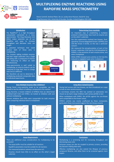 Abstract: The Agilent RapidFire™ is a high throughput autosampler. It contains a robot arm and solid phase extractor that injects samples into the connected triple quadrupole mass spectrometer. A standard RapidFire screen within The University of Dundee’s Drug Discovery Unit (DDU) usually involves around 50,000 compounds in 384-well plate format. This equates to roughly 140 hours of machine time. The DDU makes great use of the RapidFire system across various target-based discovery programs. Identifying ways to maximise its throughput while maintaining a high standard of data quality is of great interest.
