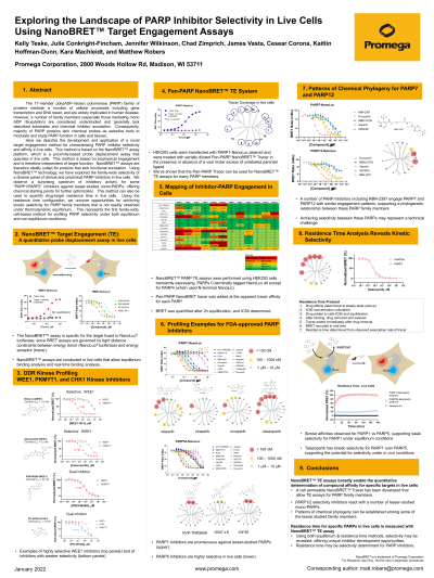 Abstract: The 17-member poly(ADP-ribose) polymerase (PARP) family of proteins mediate a number of cellular processes including gene transcription and DNA repair, and are widely implicated in human disease. However, a number of family members (especially those mediating mono ADP ribosylation) are considered understudied and generally lack described substrates and chemical inhibitor annotation. Consequently, majority of PARP proteins lack chemical probes as selective tools to modulate and study PARP function in cells and tissues. Here we describe the development and application of a novel target engagement method for characterizing PARP inhibitor selectivity and affinity in live cells. This method is based on the NanoBRET™ assay platform, which is a proximity-based probe displacement assay that operates in live cells. This method is based on biophysical engagement and is therefore independent of target function. NanoBRET™ assays are therefore ideally suited for proteins that lack functional annotation. Using NanoBRET™ technology, we have explored the family-wide selectivity of a diverse panel of clinical and preclinical PARP inhibitors in live cells. We observe a surprising spectrum of inhibitory activity for some “PARP1/PARP2” inhibitors against lesser-studied mono-PARPs, offering chemical starting points for further optimization. This method can also be used to quantify drug-target residence time in live cells. Using the residence time configuration, we uncover opportunities for achieving kinetic selectivity for PARP family members that is not readily observed under thermodynamic equilibrium. This represents the first family-wide, cell-based method for profiling PARP selectivity under both equilibrium and non-equilibrium conditions.