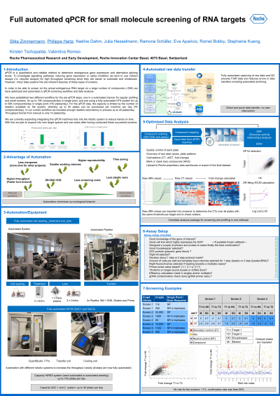 In order to be able to screen on the actual endogenous RNA target on a large number of compounds (>50K) we have optimized and automated a qPCR screening workflow and data analysis.