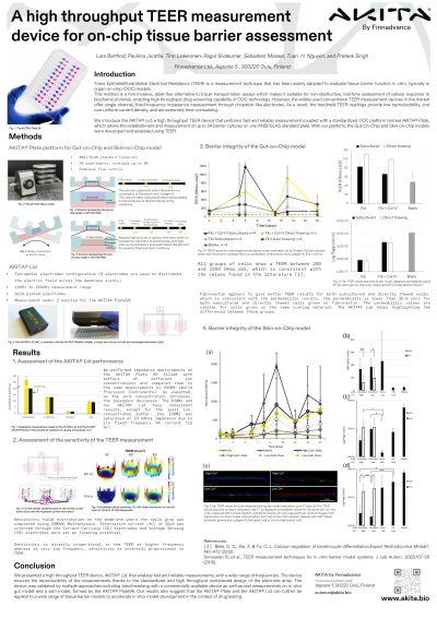 Conclusion We presented a high throughput TEER device, AKITA® LID, that enables fast and reliable measurements, with a wide range of frequencies. The device ensures the reproducibility of the measurements thanks to the standardized and high throughput multiplexed design of the electrode array. The device was validated by multiple approaches including benchmarking with a commercially available device as well as real measurements on in vitro gut model formed by the AKITA® Plate96. Our results also suggest that the AKITA® Plate and the AKITA® LID can further be applied to a wide range of tissue barrier models to accelerate in vitro model development in the context of drug testing.